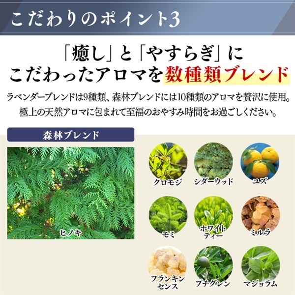 • 原料のアロマオイルは植物から抽出した天然物のため、香りが少々異なる場合がありますが、品質には問題ありません。